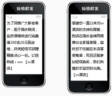 1【如家酒店】為了回饋廣大新老客戶,現(xiàn)于國(guó)慶期間,xx酒店將進(jìn)行消費(fèi)滿300送20元現(xiàn)金卷,并憑短信可獲贈(zèng)精美點(diǎn)心一份。訂座熱線:xxx 【群發(fā)此短信給當(dāng)?shù)厥謾C(jī)】