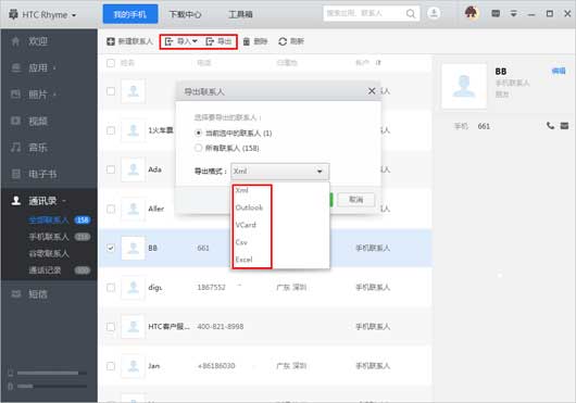 第四步:導(dǎo)入/導(dǎo)出聯(lián)系人有Xml、Outlook、vCard、CSV、Excel五種格式,在“我的手機(jī)=》通訊錄”模塊就可以選擇對全部或部分聯(lián)系人的導(dǎo)入/導(dǎo)出。