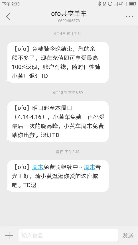 比如:【ofo】訂單破千萬(wàn)送福利今日開(kāi)啟,周四到周日(3月23日-26日)連續(xù)4天,全國(guó)騎車免費(fèi),好消息記得與好朋友分享哦!退訂TD。
